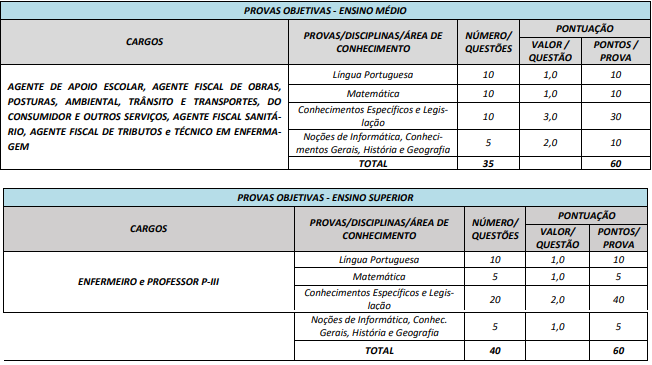 - Provas objetivas, de caráter eliminatório e classificatório, para todos os cargos;