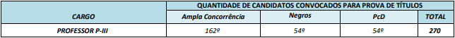 A prova de títulos, de caráter meramente classificatório, será aplicada somente para os candidatos ao cargo de PROFESSOR P-III, aprovados e classificados nas provas objetivas (1ª etapa), observado os quantitativos estabelecidos no quadro abaixo: