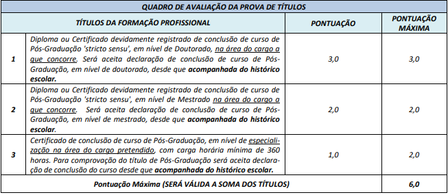 A pontuação máxima para prova de títulos será de até 6,0 (seis) pontos, sendo desconsiderados os que excederem a este limite, observando os seguintes critérios:
