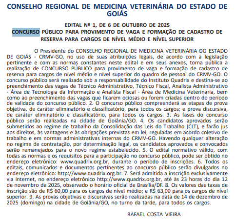 Foi publicado, em Diário Oficial da União desta segunda-feira (6/10), o extrato de edital do concurso público para o Conselho Regional de Medicina Veterinária do Estado de Goiás (CRMV GO).