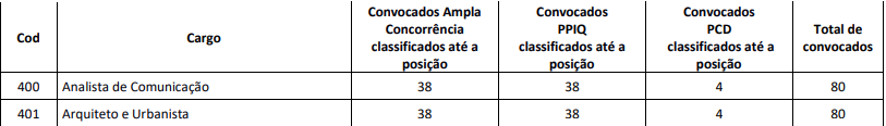 Serão convocados para a avaliação de títulos os candidatos inscritos para cargos de nível superior, aprovados nas provas objetivas e mais bem classificados até os quantitativos estabelecido no quadro a seguir, respeitados os empates na última colocação: