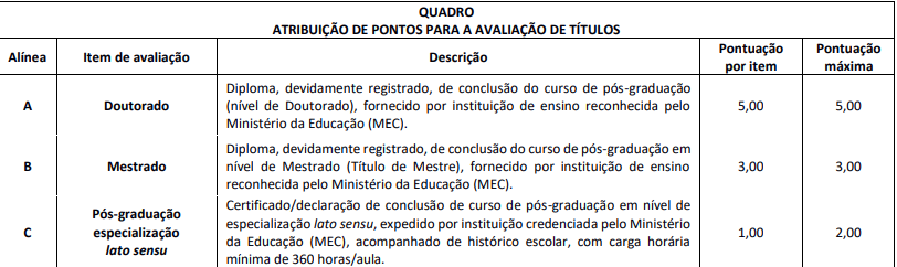 - Avaliação de títulos, de caráter classificatório, para os cargos de nível superior.