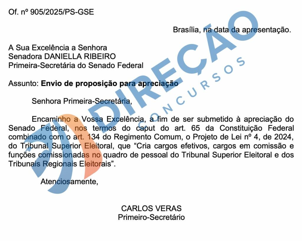 O Projeto de Lei 4/2024, que autoriza a criação mais de 474 novos cargos e funções na Justiça Eleitoral, foi oficialmente encaminhado ao Senado Federal nesta semana e agora aguarda apreciação dos senadores. A expectativa é que essas vagas sejam destinadas aos aprovados no concurso TSE Unificado.
