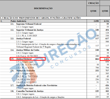 De acordo com o PLOA 2026, 4.116 provimentos estão previstos para o Poder Judiciário. Destes, 1.654 são para a Justiça Eleitoral, ou seja, para o Tribunal Superior Eleitoral (TSE) e Tribunais Regionais Eleitorais (TREs). Vale citar, ainda, que o documento prevê a criação de 804 cargos.