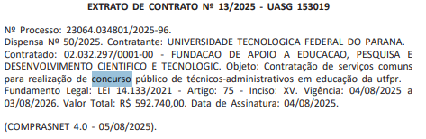 Isso porque foi publicado em Diário Oficial da União nesta quinta-feira (7/8), extrato de contrato que confirma a Funtef PR como banca organizadora do certame.