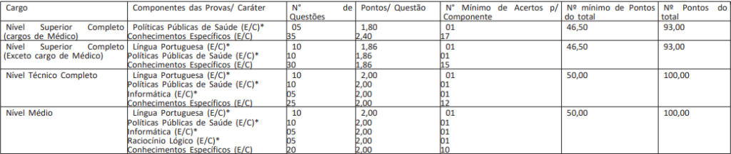 A Prova Teórico-Objetiva de cada cargo será eliminatória e classificatória e será composta por questões de múltipla escolha, com 5 (cinco) alternativas (A, B, C, D e E) e 1 (uma) única resposta correta, conforme o quadro abaixo: