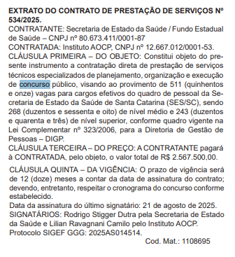 O extrato de contrato que confirma o Instituto AOCP como banca responsável pelo certame foi publicado em Diário Oficial do estado nesta terça-feira (26/8).
