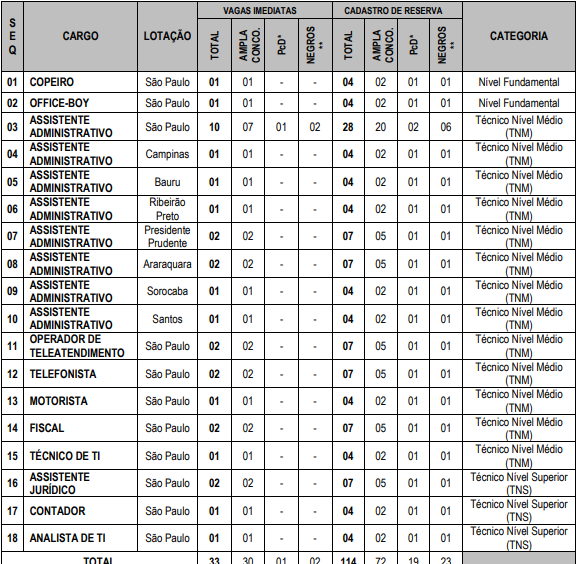 Apesar do quantitativo de vagas não ter sido divulgado até o momento, sabe-se que haverá oportunidades de níveis fundamental, médio e superior, com iniciais de até R$ 7.790,33, para os cargos seguintes: