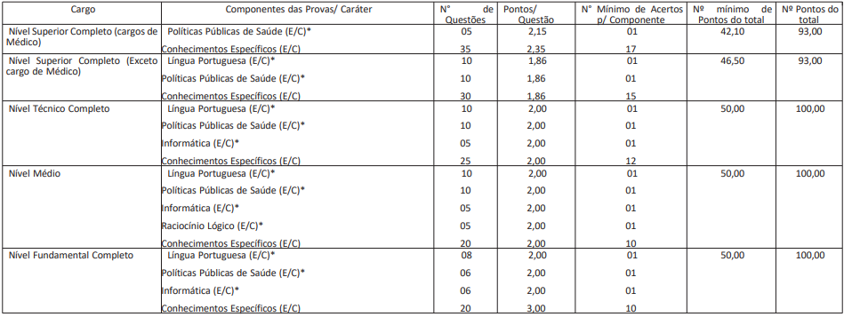 - Nível Superior (exceto médicos): Língua Portuguesa (10), Políticas Públicas de Saúde (10) e Conhecimentos Específicos (30).