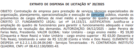 A autorização foi assinada pelo presidente Jader Pereira de Farias Neto em 4 de dezembro de 2025. O valor global previsto para a execução dos serviços é de R$ 122,00, dividido entre os processos para cargos de ensino médio (R$ 59,00 por vaga) e de ensino superior (R$ 63,00 por vaga).