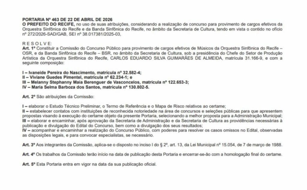 O Prefeito do Recife publicou no Diário Oficial do município, nesta quinta-feira(23/4), a Portaria nº 463, constituindo a Comissão do Concurso Público para provimento de cargos efetivos de Músicos da Orquestra Sinfônica do Recife (OSR) e da Banda Sinfônica do Recife (BSR), no âmbito da Secretaria de Cultura.