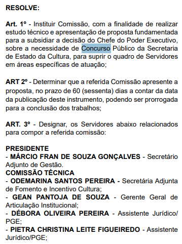 A portaria revela que a Secult já havia consultado formalmente a Secretaria de Estado da Administração (SEAD) sobre a disponibilidade de servidores efetivos de outros órgãos que pudessem ser realocados para a pasta. A SEAD respondeu que não dispõe de servidores que atendam às especificidades técnicas requeridas pela Cultura, o que reforçou a necessidade de um concurso específico.
