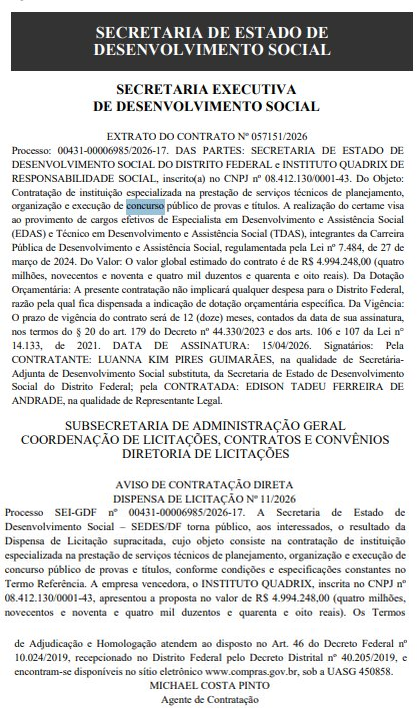 O concurso da Secretaria de Estado de Desenvolvimento Social do Distrito Federal (Sedes DF) avançou mais um passo com a publicação do extrato do contrato firmado entre a Sedes DF e o Instituto Quadrix. O documento oficializa a contratação da banca organizadora para planejar, organizar e executar o certame público de provas e títulos.