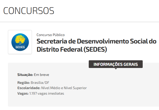O último edital do concurso Sedes DF foi publicado em 2018. Organizado pelo IBRAE, o certame ofertou 102 vagas para o cargo de Técnico em Assistente Social, que exige nível médio de formação. O salário inicial ofertado foi de R$ 2.600,00.
