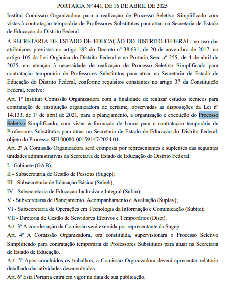 Vale lembrar que a portaria autorizando a realização do processo seletivo foi publicada no início de abril. A seleção será destinada à contratação temporária de professores substitutos para o ano letivo de 2026, podendo ser prorrogado para o ano letivo de 2027.
