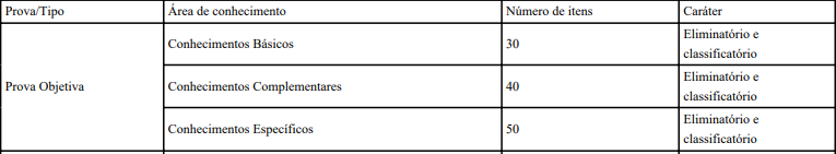 A prova objetiva, de caráter eliminatório e classificatório, será composta de 120 itens, valerá 120,00 pontos e avaliará as habilidades e os conhecimentos do candidato.