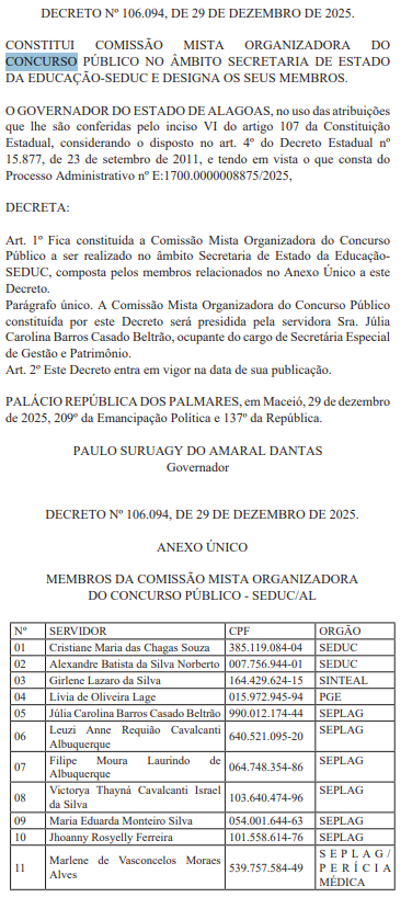 Foi publicada no Diário Oficial do estado de Alagoas nesta terça-feira (30/12) a portaria que constitui formalmente a Comissão Mista Organizadora do tão aguardado concurso Seduc AL (Secretaria de Estado da Educação de Alagoas).