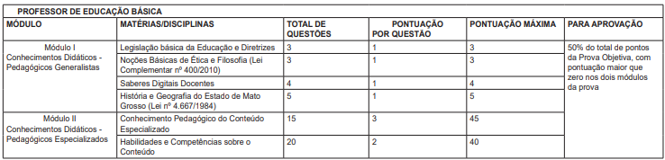 As provas objetivas serão compostas por 50 questões de múltipla escolha, com 15 questões de Conhecimentos Didático-Pedagógicos Generalistas e 35 questões de Conhecimentos Didáticos – Pedagógicos Especializados.