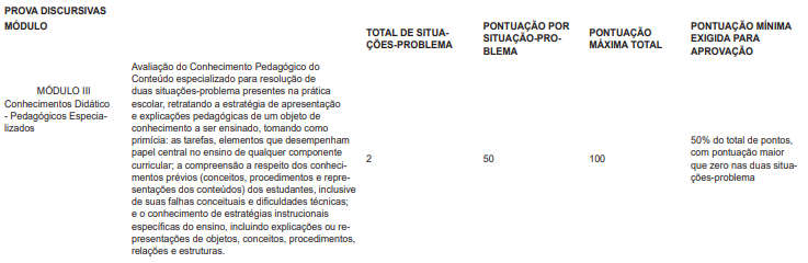 A Prova Discursiva, de caráter eliminatório e classificatório, totalizará 100 pontos e consistirá na resolução de duas situações-problema baseadas em casos escolares, com base em tema atual, inédito e relacionado ao contexto escolar.
