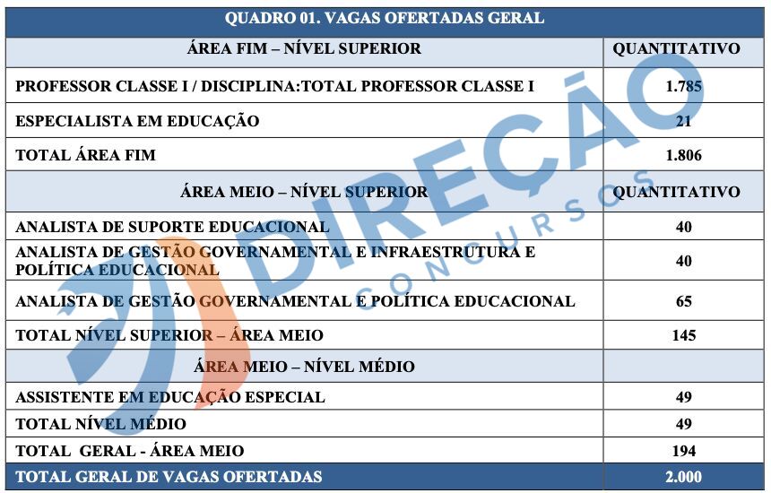 - Professor Classe I: 1.785 vagas, distribuídas entre Matemática (167), Inglês (149), Português (141), Física (142), Química (140), Educação Física (139), Artes (129), Filosofia (125), Educação Especial (119), Biologia (124), Sociologia (113), História (117), Geografia (107), Educação Geral (50), Espanhol (12) e Francês (11)