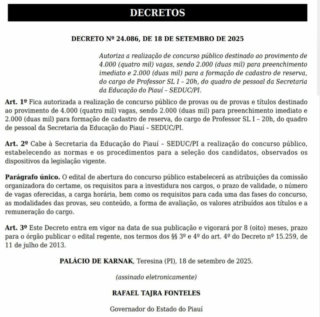 A autorização foi formalizada pelo Decreto nº 24.086, de 18 de setembro de 2025, assinado pelo governador Rafael Taira Fonteles, e publicado no Diário Oficial do Estado. Confira: