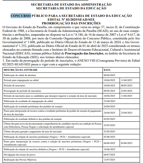 Veja, abaixo, a prorrogação do prazo de inscrição do concurso SEE PB: