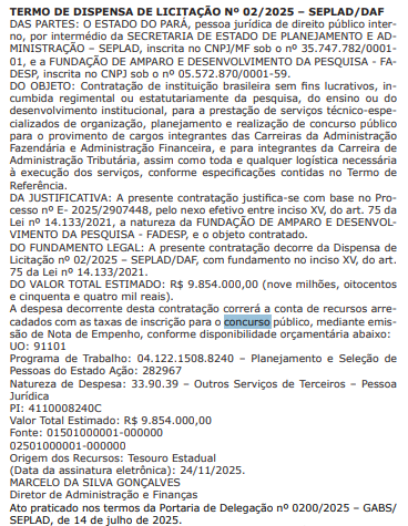 O caminho para o novo concurso Sefa PA (Secretaria de Estado da Fazenda do Pará) segue sendo desenhado. Foi publicada nesta terça-feira (25/11), em Diário Oficial do estado, dispensa de licitação que define a FADESP (Fundação de Amparo e Desenvolvimento da Pesquisa) como banca responsável pelo certame.