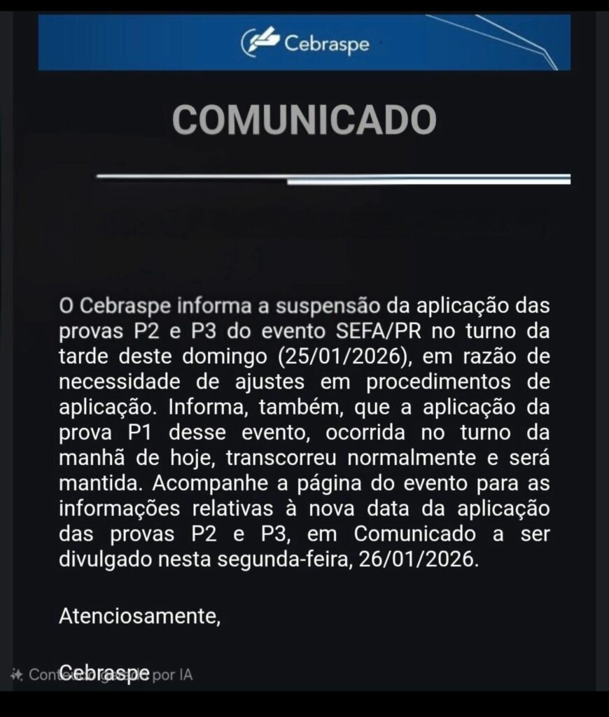 De acordo com o comunicado emitido pela banca organizadora Cebraspe, enviado por e-mail aos candidatos, o adiamento ocorreu devido à necessidade de ajustes nos procedimentos de aplicação. A Sefa PR também confirmou a informação em suas redes sociais, reforçando que a decisão foi tomada para garantir a regularidade do certame.