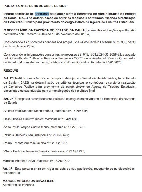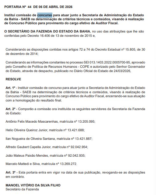 Por meio das Portarias nº 44 e nº 45, de 6 de abril de 2026, o secretário Manoel Vitório da Silva Filho instituiu as comissões internas de concurso para atuarem junto à Secretaria de Administração do Estado da Bahia (SAEB), destinadas ao provimento de cargos efetivos de Auditor Fiscal e Agente de Tributos Estaduais.