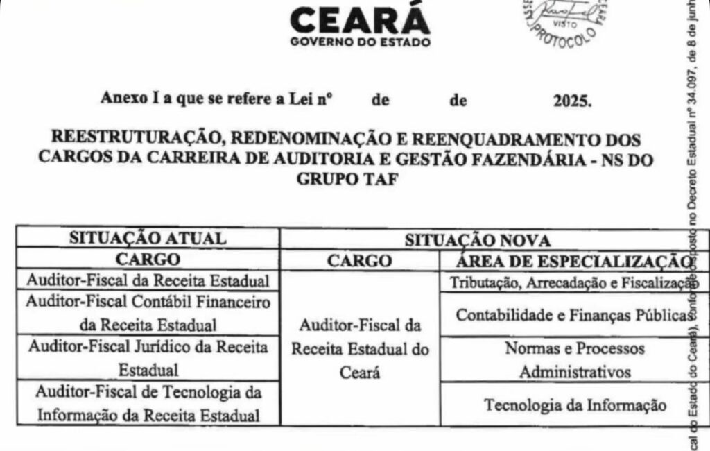 O PL, que ainda aguarda sanção do governador Elmano de Freitas (PT), altera a denominação e o reenquadramento de quatro cargos existentes, os concentrando na figura de Auditor-Fiscal da Receita Estadual do Ceará.