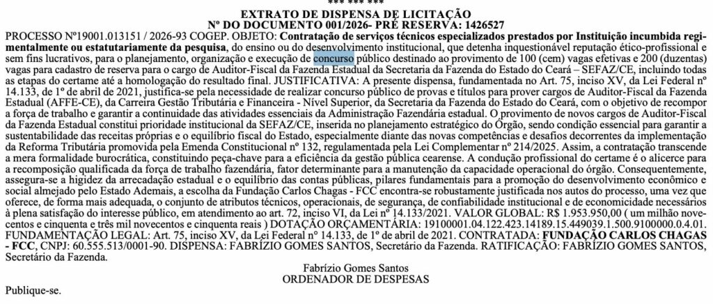 A Secretaria da Fazenda do Estado do Ceará publicou nesta quarta-feira (4/2), no Diário Oficial do Estado, a dispensa de licitação para contratação da Fundação Carlos Chagas (FCC) como banca organizadora do novo concurso Sefaz CE!