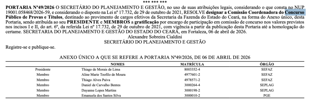 A Secretaria do Planejamento e Gestão do Estado do Ceará (Seplag-CE) designou, nesta segunda-feira (6), a Comissão Coordenadora do Concurso Público de Provas e Títulos destinado ao provimento de cargos efetivos da Secretaria da Fazenda do Estado do Ceará (Sefaz-CE).