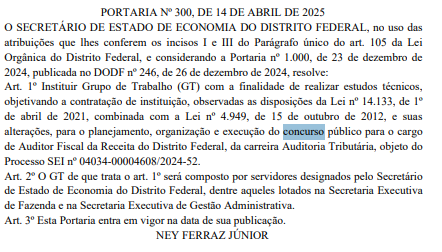 Vale lembrar que, em fevereiro de 2025, o grupo começou a ser formado e, em março, foi enviado à Coordenação de Concursos Públicos (COCP), documento com a indicação de três servidores integrantes da carreira de Auditoria Tributária do Distrito Federal para comporem o grupo.