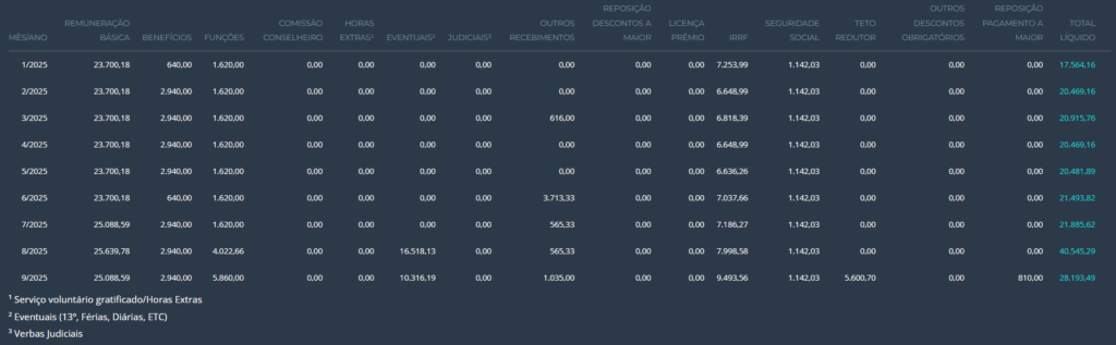 A partir da atuação na Sefaz, benefícios e adicionais pelo cumprimento de funções são adicionados aos ganhos. Em setembro de 2025, os aprovados receberam salário base de R$ 23.814,17, após descontos obrigatórios.