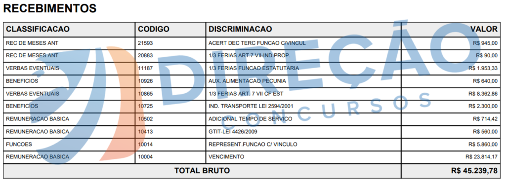 Os ganhos também incluem auxílios, somados ao salário base de R$ 28.193,49. A função de chefia adiciona benefícios próprios na remuneração do aprovado que desempenha o serviço.