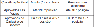 10.4 Serão considerados aprovados no concurso público os candidatos habilitados que, após a aplicação dos critérios de desempate, obtiverem classificação final dentro do quantitativo total de vagas, incluindo cadastro de reserva, conforme a tabela abaixo: