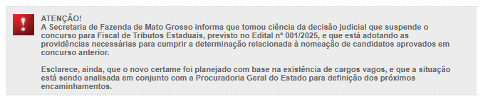 A banca organizadora FCC divulgou nota oficial confirmando a suspensão do concurso público da Secretaria de Fazenda de Mato Grosso (Sefaz MT) para o cargo de Fiscal de Tributos Estaduais, conforme Edital nº 001/2025.