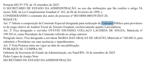 Um novo passo foi dado para a realização do concurso Sefaz RN (Secretaria de Fazendo do Rio Grande do Norte): a comissão organizadora passou por alteração.
