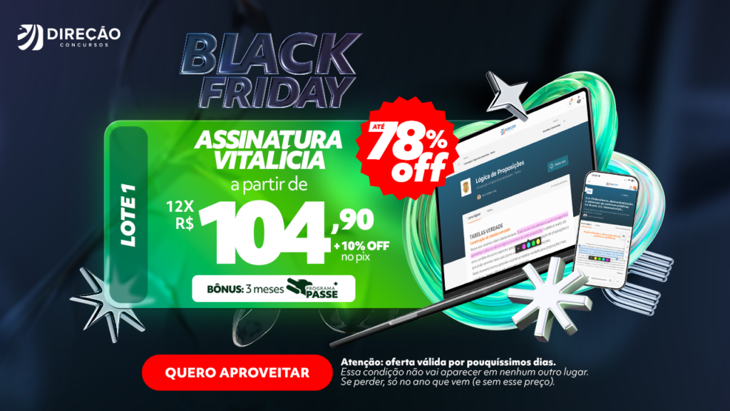 Invista no seu futuro sem pesar no seu bolso. Aproveite a Black Friday Direção Concursos e dê o próximo passo rumo à sua aprovação!