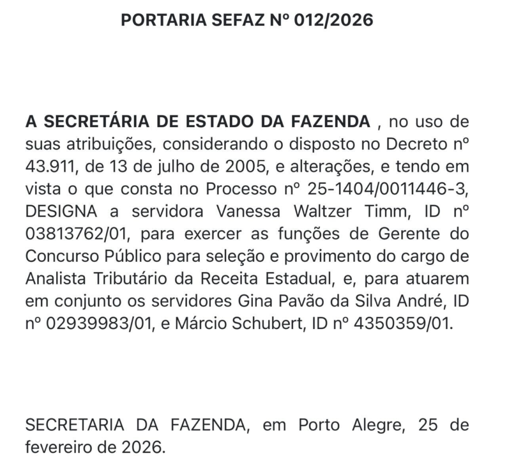 A Secretaria de Estado da Fazenda do Rio Grande do Sul (SEFAZ RS) designou os servidores responsáveis pela gestão do concurso público para o cargo de Analista Tributário da Receita Estadual. O andamento foi publicado no Diário Oficial desta sexta-feira (27/2).