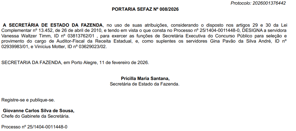 A Secretaria de Estado da Fazenda do Rio Grande do Sul (Sefaz RS) designou a servidora Vanessa Waltzer Timm para exercer as funções de Secretária Executiva do novo concurso público. Segunda a portaria publicada no Diário Oficial desta sexta-feira (13/2), o edital vai abrir vagas para Auditor Fiscal da Receita Estadual.A nomeação foi formalizada em 11 de fevereiro, as funções da Secretaria são de coordenação administrativa e operacional das etapas do processo seletivo. Entre as responsabilidades típicas do cargo estão o acompanhamento da execução do edital e a interlocução com a banca organizadora contratada.Confira a publicação:O último concurso Sefaz RS para Auditor Fiscal atingiu sua validade em abril de 2025, o que abre possibilidade para o andamento de uma nova seleção. O certame ocorreu em 2018, acompanhado por outros dois editais com vagas para Técnico Tributário e Assistente Administrativo Fazendário. Foram 150 vagas distribuídas entre os três editais, com salário inicial até R$ 20.463,50.Tenha a rotina de um aprovado!O Direção Concursos preparou para você um Ebook feito pelo professor Erick Alves, com dicas para ter a rotina e organização de um aprovado. Não perca esta oportunidade!Basta clicar no botão, a seguir e baixar seu material gratuito!QUERO MEU E-BOOKPanorama do concurso Sefaz RSComo mencionado anteriormente, o concurso Sefaz RS teve três editais publicados em 2018. Organizados pelo Cebraspe, os certames ofertaram, ao todo, 150 vagas para Auditor-Fiscal, Técnico Tributário e Assistente Administrativo Fazendário. O salário inicial foi de até R$ 20.463,50.Confira, abaixo, a distribuição das vagas:Auditor-Fiscal: 50 vagasTécnico Tributário: 50 vagasAssistente Administrativo Fazendário: 50 vagasOs candidatos foram avaliados por meio de provas objetivas, de caráter eliminatório e classificatório, compostas por questões de múltipla escolha, distribuídas da seguinte forma:Auditor-FiscalTécnico TributárioAssistente Administrativo FazendárioMantenha-se informado!O Direção possui um canal exclusivo para envio de notícias no WhatsApp! Além de todas as novidades do mundo dos concursos, lá você encontra e-books e outros materiais gratuitos, cupons EXCLUSIVOS de desconto, aulas GRATUITAS e muito mais.ENTRE AGORA NO CANAL DE NOTÍCIAS!Outros editais da área fiscal!Sefa PAOrganizado pela FADESP, o concurso Sefa PA (Secretaria de Estado da Fazenda do Pará) oferta 286 vagas, além de 356 oportunidades em cadastro reserva para Auditor Fiscal, Analista Fazendário, Analista do Tesouro e Fiscal de Receitas. O salário inicial pode chegar a até R$ 47 mil!As oportunidades são distribuídas da seguinte forma:Auditor Fiscal de Receitas Estaduais (AFRE):Vagas: 50 imediatas + 100 para cadastro de reserva.Fiscal de Receitas Estaduais (FRE):Vagas: 100 imediatas + 50 para cadastro de reserva.Analista Fazendário: 100 vagas imediatas + 120 CR.Analista Fazendário de TIC: 10 vagas imediatas + 20 CR.Analista Fazendário de Infraestrutura:Arquitetura e Urbanismo: 1 vaga imediata + 4 CR.Engenharia Civil: 1 vaga imediata + 4 CR.Engenharia Elétrica: 1 vaga imediata + 4 CR.Engenharia Mecânica: 1 vaga imediata + 4 CR.Analista Fazendário de Saúde Ocupacional:Psicologia: 1 vaga imediata + 4 CR.Serviço Social: 1 vaga imediata + 4 CR.Analista Contábil da Administração Estadual: 14 vagas imediatas + 28 CR.Analista do Tesouro Estadual – Administração: 2 vagas imediatas + 6 CR.Analista do Tesouro Estadual – Ciências Econômicas: 4 vagas imediatas + 8 CR.Os interessados poderão se inscrever pelo site da banca, até o dia 13 de fevereiro de 2026. Para homologar a candidatura será necessário efetuar o pagamento das taxas seguintes:Cargos de Área Meio: R$ 104,19.Cargos de Área Fim: R$ 114,19.As provas objetivas serão aplicadas em Belém, Altamira, Itaituba, Marabá, Redenção e Santarém, nas datas seguintes:Área Fim (Auditor Fiscal e Fiscal de Receitas)Prova de Conhecimentos Gerais: 22 de março de 2026.Prova de Conhecimentos Específicos: 29 de março de 2026.Área Meio (Analistas Fazendários e do Tesouro)Data de Aplicação: 29 de março de 2026.Veja todos os detalhes do edital!Sefaz GOO edital do concurso Sefaz GO (Secretaria de Estado da Economia de Goiás) foi republicado, após correção da reserva de vagas para cotas.São ofertadas 50 vagas imediatas, além de 25 oportunidades em cadastro reserva para Auditor Fiscal da Receita Estadual. O salário inicial é de até R$ 32.163,30.As inscrições para o concurso Sefaz GO serão realizadas exclusivamente pelo site da FCC, banca organizadora do certame. O período de inscrições é das 10h do dia 9/2/2026 às 23h59min do dia 12/3/2026 (horário de Brasília).O valor da inscrição é de R$ 250,00.As Provas Objetivas estão previstas para serem aplicadas na cidade de Goiânia/GO, no dia 17 de maio de 2026.Confira detalhes do edital!Sefaz DFA banca organizadora do concurso Sefaz DF (Secretaria de Fazenda do Distrito Federal) está definida e contratada, dessa forma, o edital de abertura pode ser publicado a qualquer momento!Foi publicado em Diário Oficial do Distrito Federal no dia 3 de novembro, extrato de contrato que confirma o Cebraspe como responsável pela seleção.Segundo o projeto básico, serão ofertadas 115 vagas imediatas, além de 150 oportunidades em cadastro reserva para o cargo de Auditor Fiscal da Receita do Distrito Federal. A carreira exige formação de nível superior em qualquer área e oferece salários iniciais que podem ultrapassar R$ 32 mil.Estude com método, não no improvisoEstudar para concurso não é sobre estudar mais, é sobre estudar melhor. Com materiais organizados, resumos direcionados, marcações digitais, caderno de anotações, sistema de questões e suporte direto dos professores, você ganha tempo, clareza e constância — exatamente o que faz diferença na reta final. Tudo foi criado e validado por quem já passou em concurso e s