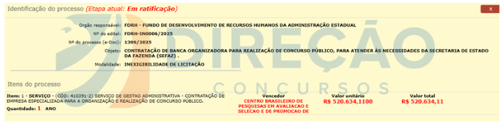 Veja, abaixo, o processo que expõe o Cebraspe como provável banca do concurso Sefaz SE!