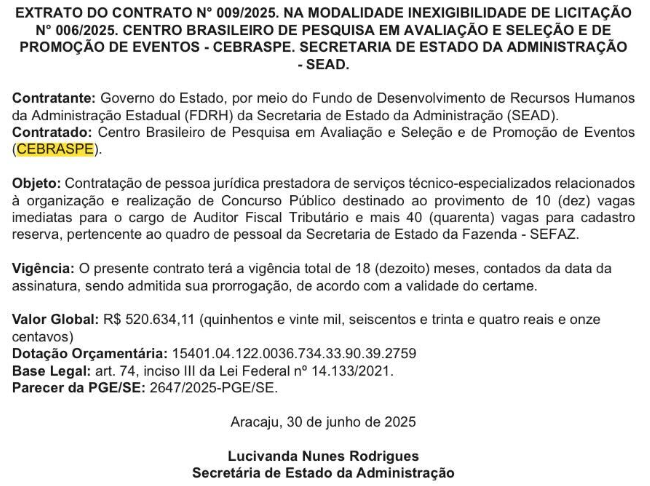 Foi divulgado o extrato do contrato para a realização do concurso Sefaz SE (Secretaria de Fazenda de Sergipe) e, dessa forma, o edital de abertura do certame poderá ser publicado a qualquer momento!