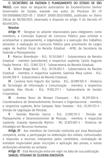 Vale lembrar que o certame foi autorizado pelo governador Tarcísio de Freitas no último 8 de agosto. Serão ofertadas 200 vagas para o cargo de Auditor Fiscal da Receita Estadual, que exige nível superior em qualquer área de formação e conta com um salário inicial de R$ 20.169,10.