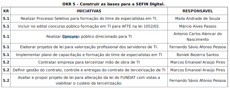 A líder para a construção das bases é a Letícia Lara Santos, com o responsável pela realização do concurso é o servidor Antonio Carlos Alencar do Nascimento.
