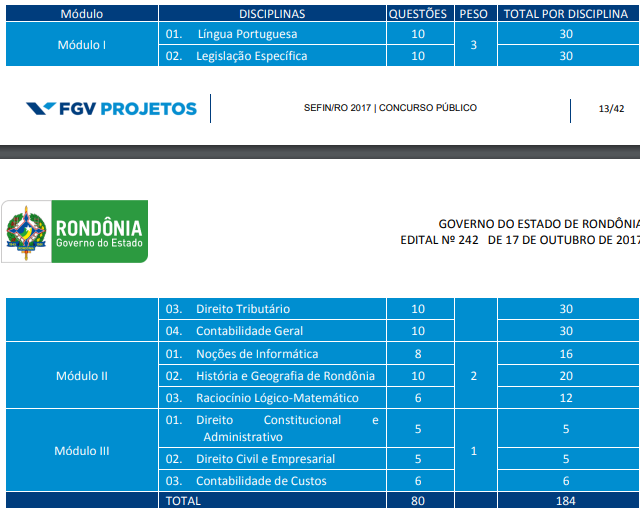 Publicado em 2017, o último edital para a Secretaria de Estado e Finanças de Rondônia ofertou 62 vagas para cargos de nível superior de formação, que foram distribuídas da seguinte forma: