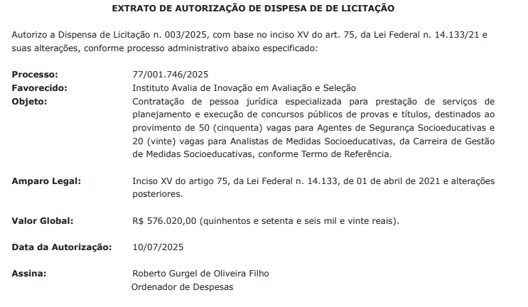 O Instituto Avalia foi definido como banca no dia 25 de junho, e o ato que autoriza a contratação foi publicado no Diário Oficial do Estado, nesta quinta-feira (10/7), como é possível ver abaixo: