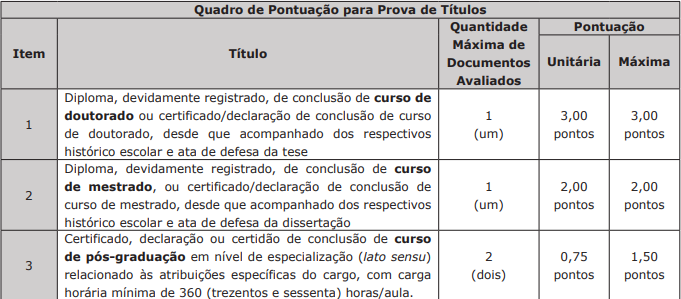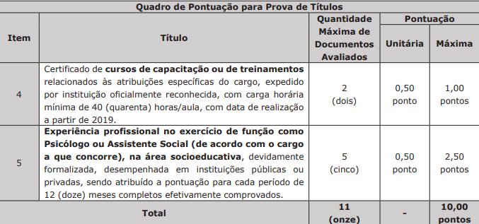 A Prova de Títulos, para candidatos ao cargo de Analista de Medidas Socioeducativas, será avaliada de 0,00 (zero) até 10,00 (dez) pontos, mesmo que a soma das pontuações dos títulos apresentados pelo candidato seja superior a esse valor, e será realizada de acordo com as especificações contidas no quadro de pontuação, conforme abaixo: