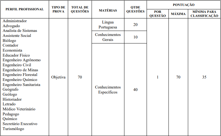 Os candidatos foram avaliados por meio de provas objetivas, compostas por 70 questões de múltipla escolha. Confira, abaixo, a estrutura das provas: