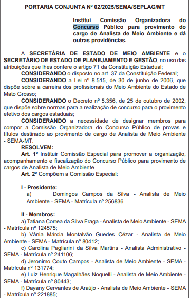 Um novo passo foi dado para a realização de um novo concurso SEMA MT (Secretaria de Estado de Meio Ambiente do Mato Grosso): foi formada a comissão organizadora do certame.
